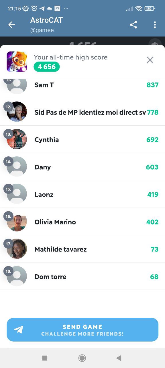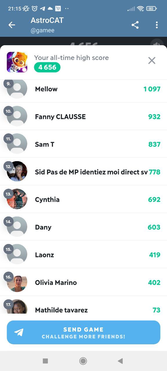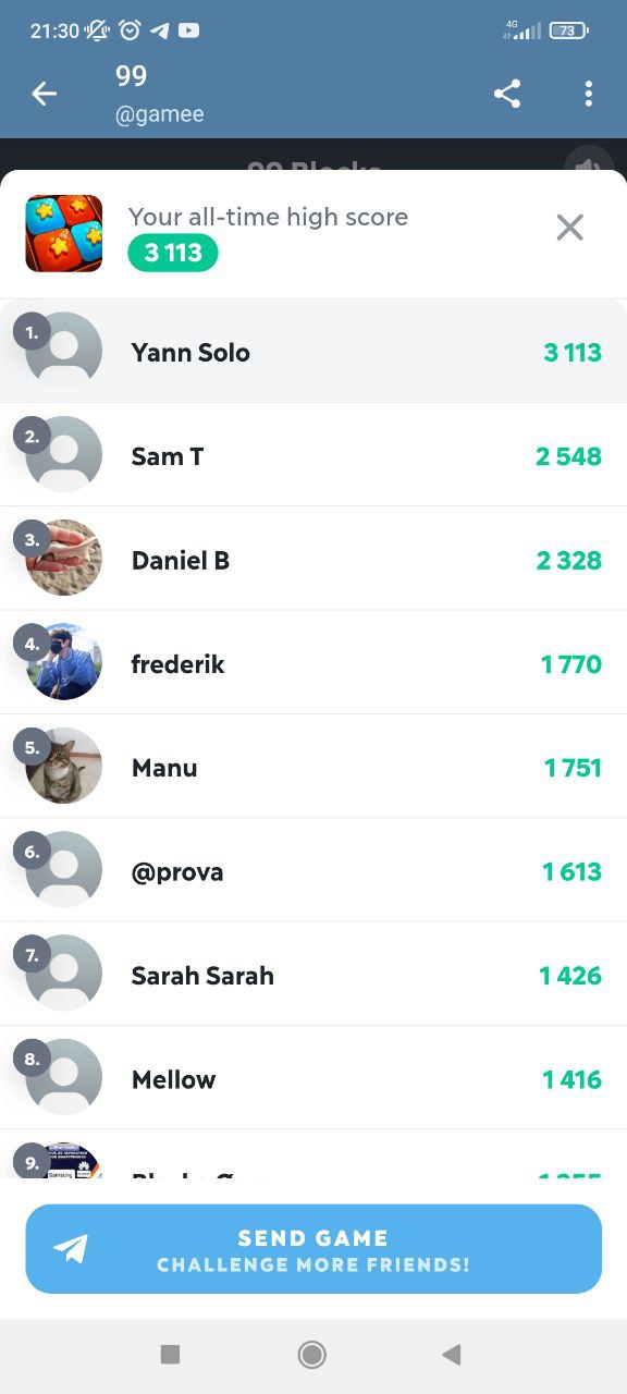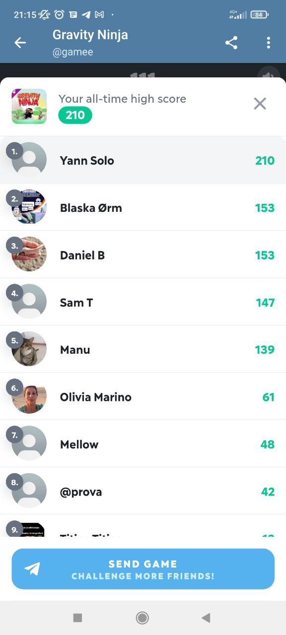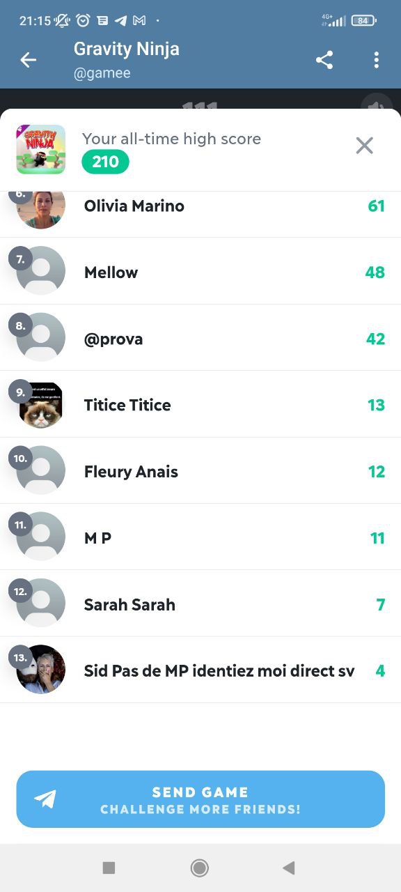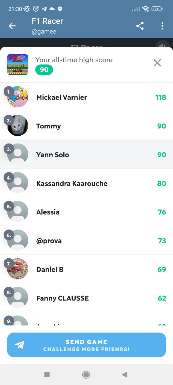 Les résultats des dernières confrontations sur le groupe, télégram. J’ai longtemps hésité à mettre le match de F1 RACE mais je me suis dis que Mickael, Blaska, Frederick ou encore Sam n’allaient pas me raté… Même si mes rivaux du moment n’étaient pas présent ces dernières temps, on peut facilement voir que de nouveau challenger arrivent à grand pas… J’ai nommé Daniel et Manu. Je tiens également à rappeler à Fleury Anaïs que cela fera 3 jours demain qu’elle m’a promis une déculottée dans 3 jours. il me tarde le jeu de demain du coup, car vu son résultat sur Gravity Ninja, il reste du boulot…
